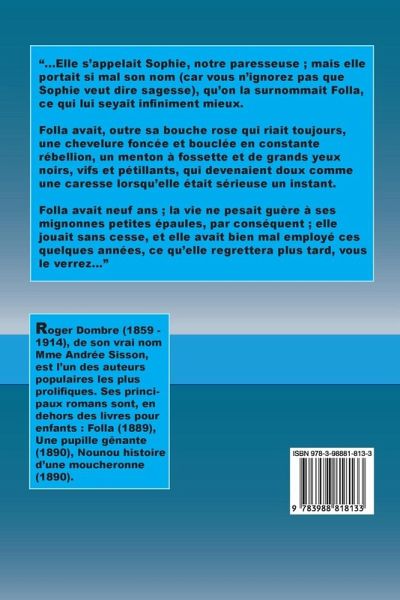 "...Elle s'appelait Sophie, notre paresseuse ; mais elle portait si mal son nom (car vous n'ignorez pas que Sophie veut dire sagesse), qu'on la surnommait Folla, ce qui lui seyait infiniment mieux. Folla avait, outre sa bouche rose qui riait toujours, une chevelure foncée et bouclée en constante rébellion, un menton à fossette et de grands yeux noirs, vifs et pétillants, qui devenaient doux comme une caresse lorsqu'elle était sérieuse un instant. Folla avait neuf ans ; la vie ne pesait guère à ses mignonnes petites épaules, par conséquent ; elle jouait sans cesse, et elle avait bien mal employé ces quelques années, ce qu'elle regrettera plus tard, vous le verrez..."