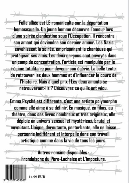 Folle alliée est LE roman culte sur la déportation homosexuelle. Un jeune homme découvre l'amour lors d'une soirée clandestine sous l'Occupation. Il rencontre son amant qui deviendra son dernier amour. Les Nazis envahissent la soirée, emprisonnent la chanteuse qui protégeait ses amis. Les deux garçons sont envoyés dans un camp de concentration, l'artiste est manipulée par le régime totalitaire pour devenir son égérie. La belle tente de retrouver les deux hommes et d'influencer le cours de l'Histoire. Mais à quel prix ! Les deux amants se retrouveront-ils ? Découvrez ce qu'ils ont vécu.Pour fêter les 20 ans de ce roman, découvrez sa réédition. Autres romans disponibles : Frondaisons du Père-Lachaise et L'imposture.