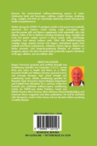 Discover the science-based wellness-enhancing powers of water, wholesome foods and beverages, walking, weight training, stretching, sleep, sunlight, and fresh air remarkably optimizing mental and physical health and performance! Written during the COVID-19 pandemic amidst a fast-paced and medically advanced 21st Century world touting costly prescription and over-the-counter pills and dietary supplements (with potentially risky side effects), Follow 4 Ws to Wellness Including Stretching, Sleep, Sunlight and Fresh Air! guides readers toward a slower tempo, safer, refreshingly simplified, and natural wellness path. Filled with healthful-inspiring nostalgic songs, popular lyricists and singers, motivational quotes from medical and fitness professionals, celebrities, historic figures, Biblical and Italian proverbs, and longevity-producing lifestyles of residents in imaginary places, this down-to-earth book profoundly impacts individuals of all ages, athletes, and non-athletes alike. About the Author Rutgers University graduate and Certified Strength and Conditioning Specialist Jim Carpentier, C.S.C.S., served thirty plus years in health and fitness as a YMCA Associate Health and Wellness Director, personal trainer and massage therapist, high school strength and conditioning coach, athletic conditioning specialist for Montclair State University's Sports Medicine Department and Football Team (Montclair, N.J.), and has written five hundred plus published wellness/sports conditioning articles for STACK.com, Better Nutrition, Coach and Athletic Director, Men's Exercise, Men's Workout, Natural Bodybuilding, and American Fitness magazines and other publications. He and his cherished wife, Rosemarie, reside in New Jersey and are devoted walkers practicing a healthy lifestyle.