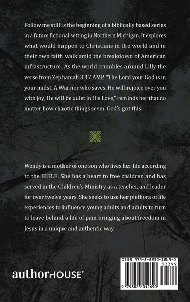 Follow me still is the beginning of a biblically based series in a future fictional setting in Northern Michigan. It explores what would happen to Christians in the world and in their own faith walk amid the breakdown of American infrastructure. As the world crumbles around Lilly the verse from Zephaniah 3:17, "The Lord your God is in your midst. A Warrior who saves. He will rejoice over you with joy; He will be quiet in His Love," reminds her that no matter how chaotic things seem, God's got this.