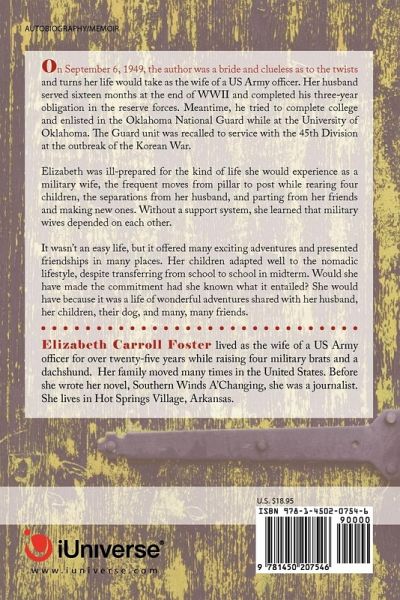 On September 6, 1949, the author was a bride and clueless as to the twists and turns her life would take as the wife of a US Army officer. Her husband served sixteen months at the end of WWII and completed his three-year obligation in the reserve forces. Meantime, he tried to complete college and enlisted in the Oklahoma National Guard while at the University of Oklahoma. The Guard unit was recalled to service with the 45th Division at the outbreak of the Korean War. Elizabeth was ill-prepared for the kind of life she would experience as a military wife, the frequent moves from pillar to post while rearing four children, the separations from her husband, and parting from her friends and making new ones. Without a support system, she learned that military wives depended on each other. It wasn't an easy life, but it offered many exciting adventures and presented friendships in many places. Her children adapted well to the nomadic lifestyle, despite transferring from school to school in midterm. Would she have made the commitment had she known what it entailed? She would have because it was a life of wonderful adventures shared with her husband, her children, their dog, and many, many friends.