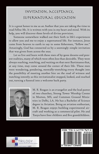 It is a great honor to me as an Author that you are taking the time to read Follow Me. It is written with you in my heart and mind. With its help, you will discover three levels of divine provision. Someone somewhere walked out their faith in life's experiences to allow you and me to enjoy a supernatural life. For instance, Jesus came from heaven to earth to say to some fishermen, "follow me." Amazingly, God has connected us by a seemingly simple invitation that was given from across the seas. Let us live and learn with these men of by-gone dreams and present realities, many of which were often less than desirable. They were always reaching, watching, and waiting on that next Bartimaeus that, at any time, may come around the corner of their life. These men were wondering, pondering, mentally-stretching every thought into the possibility of meeting another bier on the road of witness and watching intently as this invitationalist stopped, looked, and reached out, turning a funeral into a welcome back party.