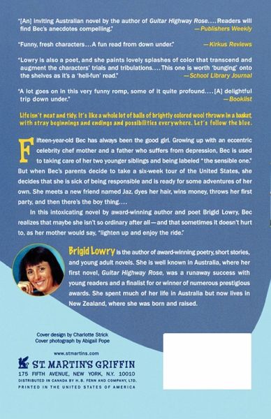 Life isn't neat and tidy. It's like a whole lot of balls of brightly colored wool thrown in a basket, with stray beginnings and endings and possibilities everywhere. Let's follow the blue. Fifteen-year-old Bec has always been the good girl. Growing up with an eccentric celebrity chef mother and a father who suffers from depression, Bec is used to taking care of her two younger siblings and being labeled "the sensible one." But when Bec's parents decide to take a six-week tour of the U.S., she decides that she is sick of being responsible and is ready for some adventures of her own. She meets a new friend named Jaz, dyes her hair, wins money, throws her first party, and then there's the boy thing... In this intoxicating novel by award-winning author and poet Brigid Lowry, Bec realizes that maybe she isn't so ordinary after all-and that sometimes it doesn't hurt to, as her mother would say, "lighten up and enjoy the ride."