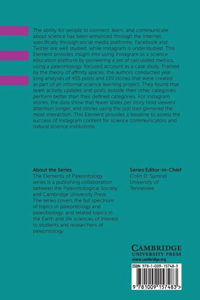 This Element provides insight into using Instagram as a science education platform by pioneering a set of calculated metrics, using a paleontology-focused account as a case study. The authors conducted year-long analyses of 455 posts and 139 stories that were created as part of an informal science learning project.