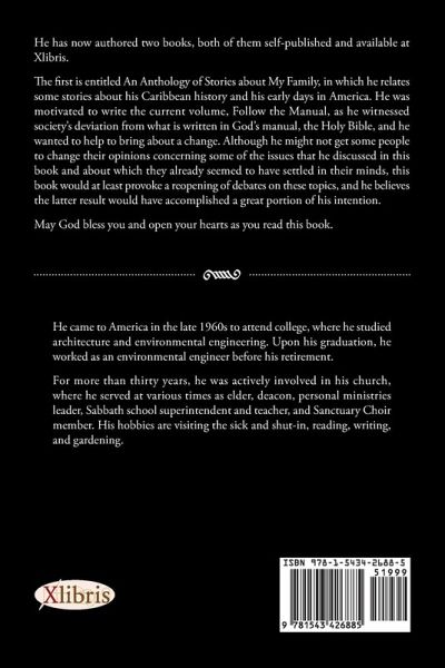 He has now authored two books, both of them self-published and available at Xlibris. The first is entitled An Anthology of Stories about My Family, in which he relates some stories about his Caribbean history and his early days in America. He was motivated to write the current volume, Follow the Manual, as he witnessed society's deviation from what is written in God's manual, the Holy Bible,,and he wanted to help to bring about a change. Although he might not get some people to change their opinions concerning some of the issues that he discussed in this book and about which they already seemed to have settled in their minds, this book would at least provoke a reopening of debates on these topics, and he believes the latter result would have accomplished a great portion of his intention. May God bless you and open your hearts as you read this book.