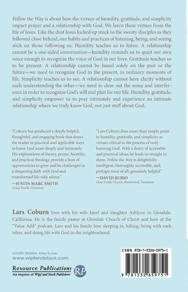 Follow the Way is about how the virtues of humility, gratitude, and simplicity impact prayer and a relationship with God. We learn these virtues from the life of Jesus. Like the dust Jesus kicked up stuck to the sweaty disciples as they followed close behind, our habits and practices of listening, being, and seeing stick on those following us. Humility teaches us to listen. A relationship cannot be a one-sided conversation--humility reminds us to quiet our own voice enough to recognize the voice of God in our lives. Gratitude teaches us to be present. A relationship cannot be based solely on the past or the future--we need to recognize God in the present, in ordinary moments of life. Simplicity teaches us to see. A relationship cannot have clarity without each understanding the other--we need to clear out the noise and interference in order to recognize God's will and plan for our life. Humility, gratitude, and simplicity empower us to pray intimately and experience an intimate relationship where we truly know God, not just stuff about God.