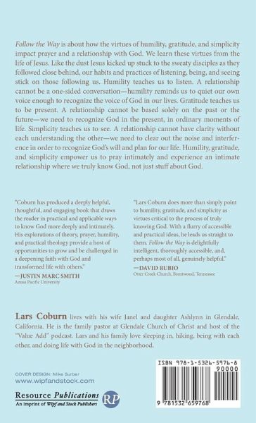 Follow the Way is about how the virtues of humility, gratitude, and simplicity impact prayer and a relationship with God. We learn these virtues from the life of Jesus. Like the dust Jesus kicked up stuck to the sweaty disciples as they followed close behind, our habits and practices of listening, being, and seeing stick on those following us. Humility teaches us to listen. A relationship cannot be a one-sided conversation--humility reminds us to quiet our own voice enough to recognize the voice of God in our lives. Gratitude teaches us to be present. A relationship cannot be based solely on the past or the future--we need to recognize God in the present, in ordinary moments of life. Simplicity teaches us to see. A relationship cannot have clarity without each understanding the other--we need to clear out the noise and interference in order to recognize God's will and plan for our life. Humility, gratitude, and simplicity empower us to pray intimately and experience an intimate relationship where we truly know God, not just stuff about God.