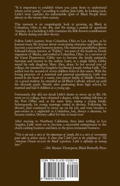 "It is important to establish where you came from to understand where you're going," according to author, Jimi Little. In doing so, Little's memoir captures the indomitable spirit of Black People from slavery to the twenty-first century. This memoir is an unapologetic look at growing up Black in Columbus, Ohio in the 40s, and 50s during a period of apartheid America. Follow Little's journey from Columbus, Ohio to Los Angeles, as he learned many life lessons about overcoming obstacles and hurdles to become a successful business person. His maternal grandfather, James Edward Gibson, known as "Gibby," who was part of the South-to-North migration of Blacks, settled in Columbus, Ohio. As a survivor of the Great Depression, Gibby was to become the family patriarch, historian and mentor to the author. Later, as a single father, Gibby raised his only daughter, Mary Alice Gibson, alone. In her second year of college, she married her longtime boyfriend, Joseph Arthur Little. The author was the second of seven children born to this union. With the loving presence of a maternal and paternal grandparent, Little was reared in the heart of a warm, two-parent family in Middle America. As a good student, he attended an all-Black Catholic school up until the eleventh grade. Shortly after graduating from high school, he married and had 4 children at a young age. Fortunately, this did not derail Little's desire to move up in life. He went on to college, then obtained a degree, while working full-time at the Post Office and, at the same time, raising a young family. Subsequently, his marriage ended in divorce. Following his divorce, Jimi continued to move up on his job, and even became a part-owner in a nightclub in Columbus, but, always a dreamer, he became restless. Destiny called for him to head west. After moving to Northern California, then later settling in Los Angeles, Little went on to become a successful entrepreneur in the check cashing business and later, in the pizza restaurant business. "This is not only a story of the importance of family, this is a story of overcoming great odds to achieve success. It shows Jimi Little's part in the symphony of The American Dream vis-à-vis the Black experience. Little is definitely an unsung hero." Dr. Maxine Thompson, Black Butterfly Press