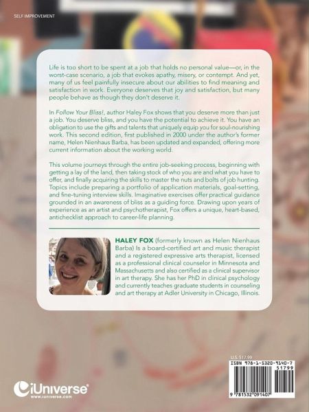 Life is too short to be spent at a job that holds no personal value-or, in the worst-case scenario, a job that evokes apathy, misery, or contempt. And yet, many of us feel painfully insecure about our abilities to find meaning and satisfaction in work. Everyone deserves that joy and satisfaction, but many people behave as though they don't deserve it. In Follow Your Bliss!, author Haley Fox shows that you deserve more than just a job. You deserve bliss, and you have the potential to achieve it. You have an obligation to use the gifts and talents that uniquely equip you for soul-nourishing work. This second edition, first published in 2000 under the author's former name, Helen Nienhaus Barba, has been updated and expanded, offering more current information about the working world. This volume journeys through the entire job-seeking process, beginning with getting a lay of the land, then taking stock of who you are and what you have to offer, and finally acquiring the skills to master the nuts and bolts of job hunting. Topics include preparing a portfolio of application materials, goal-setting, and fine-tuning interview skills. Imaginative exercises offer practical guidance grounded in an awareness of bliss as a guiding force. Drawing upon years of experience as an artist and psychotherapist, Fox offers a unique, heart-based, antichecklist approach to career-life planning.
