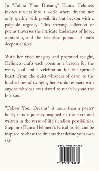 In "Follow Your Dreams," Hanna Helimets invites readers into a world where dreams not only sparkle with possibility but beckon with a palpable urgency. This stirring collection of poems traverses the intricate landscapes of hope, aspiration, and the relentless pursuit of one's deepest desires. With her vivid imagery and profound insight, Helimets crafts each poem as a beacon for the weary soul and a celebration for the spirited heart. From the quiet whispers of dawn to the loud echoes of twilight, her words resonate with anyone who has ever dared to reach beyond the horizon. "Follow Your Dreams" is more than a poetry book; it is a journey mapped in the stars and written in the verse of life's endless possibilities. Step into Hanna Helimets's lyrical world, and be inspired to chase the dreams that define your own sky. Copyright © 2024 Book Fairy Publishing