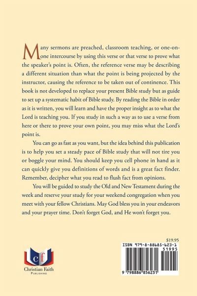Many sermons are preached, classroom teaching, or one-on-one intercourse by using this verse or that verse to prove what the speaker's point is. Often, the reference verse may be describing a different situation than what the point is being projected by the instructor, causing the reference to be taken out of continence. This book is not developed to replace your present Bible study but as guide to set up a systematic habit of Bible study. By reading the Bible in order as it is written, you will learn and have the proper insight as to what the Lord is teaching you. If you study in such a way as to use a verse from here or there to prove your own point, you may miss what the Lord's point is. You can go as fast as you want, but the idea behind this publication is to help you set a steady pace of Bible study that will not tire you or boggle your mind. You should keep you cell phone in hand as it can quickly give you definitions of words and is a great fact finder. Remember, decipher what you read to flush fact from opinions. You will be guided to study the Old and New Testament during the week and reserve your study for your weekend congregation when you meet with your fellow Christians. May God bless you in your endeavors and your prayer time. Don't forget God, and He won't forget you.