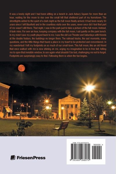 It was a lonely night and I had been sitting on a bench in Jack Asbury Square for more than an hour, waiting for the moon to rise over the small hill that sheltered part of my hometown. The streetlights added to the quiet of a dark night as the full moon finally arrived. It had been nearly 50 years since I left Bluefield and in the countless visits over the years, never once did I feel that part of me wasn't still there. That night, I was in the park just to take a picture of the full moon. Instead, it took mine. For over an hour, keeping company with the full moon, I sat quietly on the park bench. In my mind I saw my youth played back to me. I saw the old Lee Theater and Saturdays with friends at the double feature, the buildings no longer there. The railroad tracks, the sad moments, many questions, and the little things that found a place in my heart to be protected and remembered. In my wanderlust I left my footprints on so much of our small town. This full moon, like an old friend that once walked with me is now shining on me, urging my imagination to be in free fall; telling me to open that invisible window, to see again what shouldn't be lost, challenging me not to forget. Footprints are surprisingly easy to find. Following them is when the fun begins.