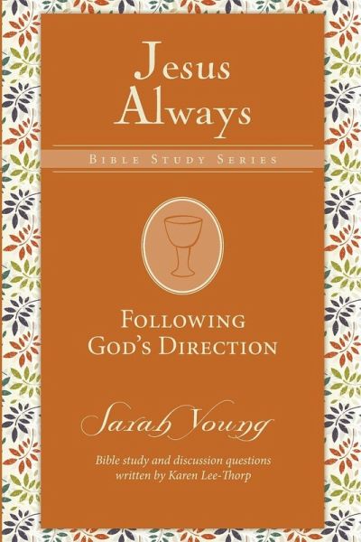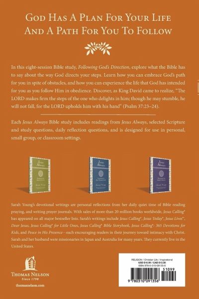 In this eight-session Bible study, Following God's Direction, explore what the Bible has to say about the way God directs you steps. Learn how you can embrace God's path for you in spite of obstacles, and how you can experience the life that God has intended for you as you follow Him in obedience. Discover, as King David came to realize, "The LORD upholds him with his hand" (Psalm 37:23-24). Sessions Include: 1. Following God By Treasuring His Wisdom 2. Following God By Trusting In Him 3. Following God By Honoring Him 4. Following God By Praying for Guidance 5. Following God By Shunning Worldly Wisdom 6. Following God By Loving His Word 7. Following God By Listening to the Spirit of Truth 8. Following God By Obeying the Holy Spirit's Promptings Each Jesus Always Bible study includes readings from Jesus Always, selected Scripture and study questions, daily reflection questions, and is designed for use in personal, small group, or classroom settings.