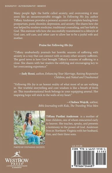 Many people fight the battle called anxiety, and overcoming it may seem like an unsurmountable struggle. In Following His Joy, author Tiffany Anderson provides a personal account of complete healing from postpartum, panic disorder, depression, and anxiety. She shares how she was helped by modern medicine, traditional counseling, and her faith in God. This memoir tells how she successfully transitioned to a lifestyle of God care, self-care, and other care to allow her to be a joyful wife and mother. Praise for Following His Joy "Tiffany unabashedly journals her horrific seasons of suffering with anxiety in a way that can connect with so many other anxiety-sufferers. The good news is how God brought Tiffany's seasons of suffering to a close. She shares with her readers the edifying and encouraging key to her overcoming experience." -Judy Rossi, author, Enhancing Your Marriage, Raising Responsive Children, and Naked and Unashamed "Following His Joy is an honest reality of what most of us are walking in. Her truthful storytelling and core wisdom is like a breath of fresh air. This transformational book belongs in your equipping arsenal. Her inspiring hope will stick to the walls of my heart." -Chelsea Wojcik, author, Bible Journaling with Kids, The Traveling Wise Me