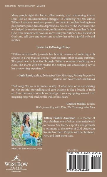 Many people fight the battle called anxiety, and overcoming it may seem like an unsurmountable struggle. In Following His Joy, author Tiffany Anderson provides a personal account of complete healing from postpartum, panic disorder, depression, and anxiety. She shares how she was helped by modern medicine, traditional counseling, and her faith in God. This memoir tells how she successfully transitioned to a lifestyle of God care, self-care, and other care to allow her to be a joyful wife and mother. Praise for Following His Joy "Tiffany unabashedly journals her horrific seasons of suffering with anxiety in a way that can connect with so many other anxiety-sufferers. The good news is how God brought Tiffany's seasons of suffering to a close. She shares with her readers the edifying and encouraging key to her overcoming experience." -Judy Rossi, author, Enhancing Your Marriage, Raising Responsive Children, and Naked and Unashamed "Following His Joy is an honest reality of what most of us are walking in. Her truthful storytelling and core wisdom is like a breath of fresh air. This transformational book belongs in your equipping arsenal. Her inspiring hope will stick to the walls of my heart." -Chelsea Wojcik, author, Bible Journaling with Kids, The Traveling Wise Me