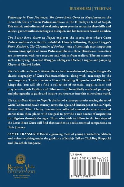 Following in Your Footsteps - The Lotus-Born Guru in Nepal connects the reader with the sacred sites of Padmasambhava - the forefather of Tibetan Buddhism. It provides guidance through multiple resources, so that today's practitioners can follow in his footsteps and bring blessings onto their path. This book is the first of a three-part series dedicated to the sacred sites of the Lotus-Born in Nepal, India, and Tibet. To begin, Nepal's Kathmandu plays a pivotal role in his life story, fueled by his commanding aspiration. As he journeyed to many places outside the valley, he left an incredible imprint on each one. Wherever he went, he practiced, gave powerful instructions, subjugated negative energies, and left a legacy present to this very day. Travel with us through these pages and discover the history and benefits of practices offered to support our pilgrimage.