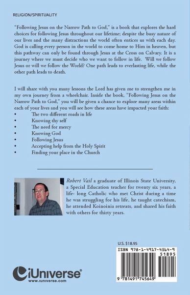 "Following Jesus on the Narrow Path to God," is a book that explores the hard choices for following Jesus throughout our lifetime; despite the busy nature of our lives and the many distractions the world often entices us with each day. God is calling every person in the world to come home to Him in heaven, but this pathway can only be found through Jesus at the Cross on Calvary. It is a journey where we must decide who we want to follow in life. Will we follow Jesus or will we follow the World? One path leads to everlasting life, while the other path leads to death. I will share with you many lessons the Lord has given me to strengthen me in my own journey from a wheelchair. Inside the book, "Following Jesus on the Narrow Path to God," you will be given a chance to explore many areas within each of your lives and you will see how these areas have impacted your faith: ¿ The two different roads in life ¿ Knowing thy self ¿ The need for mercy ¿ Knowing God ¿ Following Jesus ¿ Accepting help from the Holy Spirit ¿ Finding your place in the Church