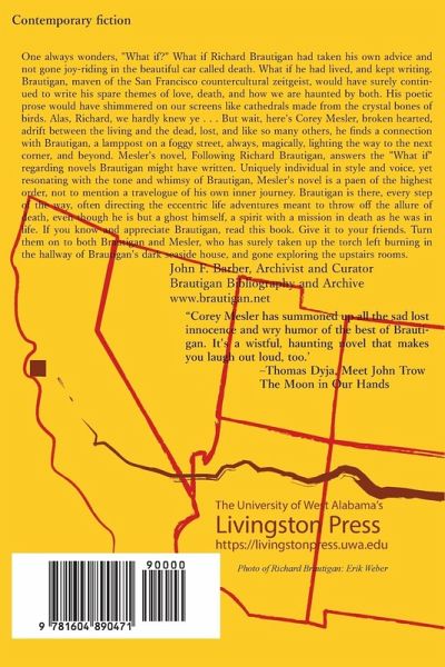 Following Richard Brautigan concerns a young writer of bad poetry living in Oklahoma City in the late 80s, who is visited by the ghost of the hippie writer Richard Brautigan. Jack, when the visitation occurs, is recovering from an aborted love affair, which coincidentally happened in San Francisco. That city becomes the focal point of the story, the place where magic can happen, a place seemingly out of time and between-worlds.