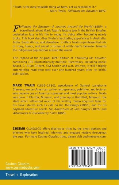 "Truth is the most valuable thing we have. Let us economize it." -Mark Twain, Following the Equator (1897) Following the Equator-A Journey Around the World (1889), a travel book about Mark Twain's lecture tour in the British Empire, undertaken late in his life to repay his debts after becoming nearly broke. This book describes Twain's fascinating experiences in Australia, India, South Africa, and elsewhere. It offers Twain's quintessential mix of irony, humor, and social criticism of white man's behavior towards the indigenous populations around the world. This replica of the original 1897 edition of Following the Equator, containing 192 illustrations by multiple illustrators, including Daniel Beard, C. Allan Gilbert, F.M Senior, and C.H. Warren, is one hundred and twenty years after its initial publication still a highly entertaining read.