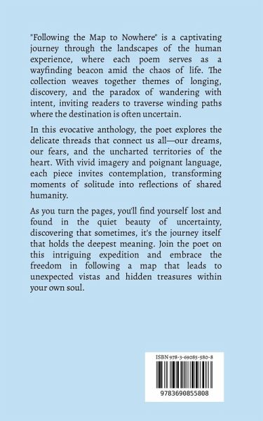 "Following the Map to Nowhere" is a captivating journey through the landscapes of the human experience, where each poem serves as a wayfinding beacon amid the chaos of life. The collection weaves together themes of longing, discovery, and the paradox of wandering with intent, inviting readers to traverse winding paths where the destination is often uncertain. In this evocative anthology, the poet explores the delicate threads that connect us all-our dreams, our fears, and the uncharted territories of the heart. With vivid imagery and poignant language, each piece invites contemplation, transforming moments of solitude into reflections of shared humanity. As you turn the pages, you'll find yourself lost and found in the quiet beauty of uncertainty, discovering that sometimes, it's the journey itself that holds the deepest meaning. Join the poet on this intriguing expedition and embrace the freedom in following a map that leads to unexpected vistas and hidden treasures within your own soul.