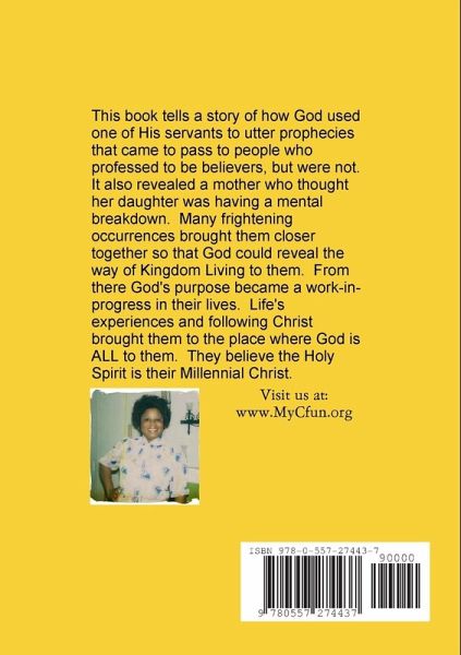 This book tells a story of how God used one of His servants to utter prophecies that came to pass to people who professed to be believers, but were not. It also revealed a mother who thought her daughter was having a mental breakdown. Many frightening occurrences brought them closer together so that God could reveal the way of Kingdom Living to them. From there God's purpose became a work-in-progress in their lives. Life's experiences and following Christ brought them to the place where God is ALL to them. They believe the Holy Spirit is their Millennial Christ.
