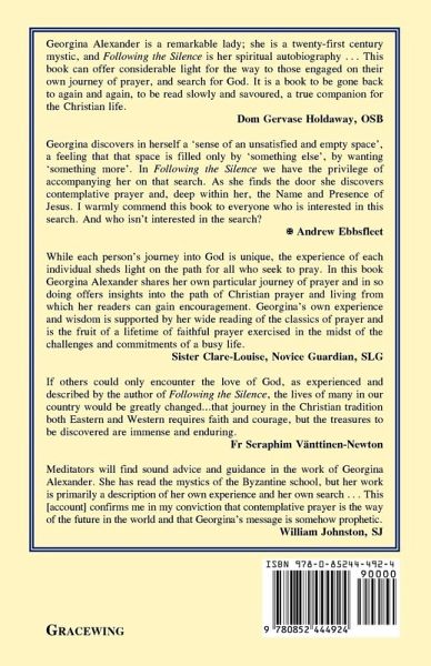 Georgina Alexander is a remarkable lady; she is a twenty-first century mystic, and Following the Silence is her spiritual autobiography...This book can offer considerable light for the way to those engaged on their own journey of prayer, and search for God. It is a book to be gone back to again and again, to be read slowly and savoured, a true companion for the Christian life. Dom Gervase Holdaway, OSB Georgina discovers in herself a 'sense of an unsatisfied and empty space', a feeling that that space is filled only by 'something else', by wanting 'something more'. In Following the Silence we have the privilege of accompanying her on that search. As she finds the door she discovers contemplative prayer and, deep within her, the Name and Presence of Jesus. I warmly commend this book to everyone who is interested in this search. And who isn't interested in the search? + Andrew Ebbsfleet While each person's journey into God is unique, the experience of each individual sheds light on the path for all who seek to pray. In this book Georgina Alexander shares her own particular journey of prayer and in so doing offers insights into the path of Christian prayer and living from which her readers can gain encouragement. Georgina's own experience and wisdom is supported by her wide reading of the classics of prayer and is the fruit of a lifetime of faithful prayer exercised in the midst of the challenges and commitments of a busy life. Sister Clare-Louise,Novice Guardian,SLG If others could only encounter the love of God, as experienced and described by the author of Following the Silence, the lives of many in our country would be greatly changed...that journey in the Christian tradition both Eastern and Western requires faith and courage, but the treasures to be discovered are immense and enduring. Fr Seraphim Vänttinen-Newton Meditators will find sound advice and guidance in the work of Georgina Alexander. She has read the mystics of the Byzantine school, but her work is primarily a description of her own experience and her own search ... This [account] confirms me in my conviction that contemplative prayer is the way of the future in the world and that Georgina's message is somehow prophetic. William Johnston,SJ