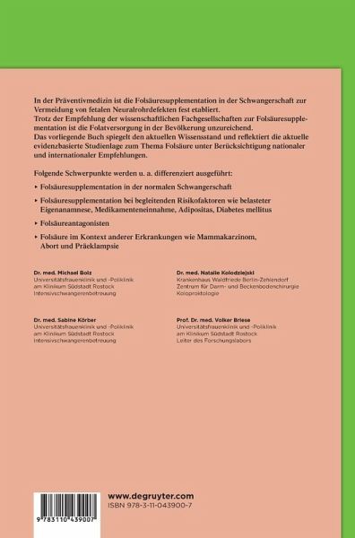 Das vorliegende Buch stellt den aktuellen Wissenstand dar. Darüberhinaus wird eine evidenzbasierte Stellungnahme zur Studienlage hinsichtlich Folsäuresupplementation unter Einbeziehung der aktuellen Leitlinien gegeben.