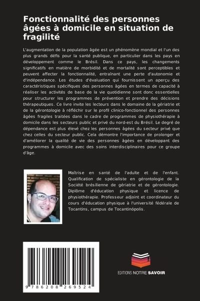 L'augmentation de la population âgée est un phénomène mondial et l'un des plus grands défis pour la santé publique, en particulier dans les pays en développement comme le Brésil. Dans ce pays, les changements significatifs en matière de morbidité et de mortalité sont perceptibles et peuvent affecter la fonctionnalité, entraînant une perte d'autonomie et d'indépendance. Les études d'évaluation qui fournissent un aperçu des caractéristiques spécifiques des personnes âgées en termes de capacité à réaliser les activités de base de la vie quotidienne sont donc essentielles pour structurer les programmes de prévention et prendre des décisions thérapeutiques. Ce livre invite les lecteurs dans le domaine de la gériatrie et de la gérontologie à réfléchir sur le profil clinico-fonctionnel des personnes âgées fragiles traitées dans le cadre de programmes de physiothérapie à domicile dans les secteurs public et privé du nord-est du Brésil. Le degré de dépendance est plus élevé chez les personnes âgées du secteur privé que chez celles du secteur public. Cela démontre l'importance de prolonger et d'améliorer la qualité de vie des personnes âgées en développant des programmes à domicile avec des soins interdisciplinaires pour ce groupe d'âge.