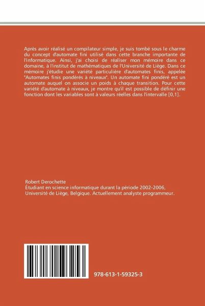 Après avoir réalisé un compilateur simple, je suis tombé sous le charme du concept d'automate fini utilisé dans cette branche importante de l'informatique. Ainsi, j'ai choisi de réaliser mon mémoire dans ce domaine, à l'institut de mathématiques de l'Université de Liège. Dans ce mémoire j'étudie une variété particulière d'automates finis, appelée "Automates finis pondérés à niveaux". Un automate fini pondéré est un automate auquel on associe un poids à chaque transition. Pour cette variété d'automate à niveaux, je montre qu'il est possible de définir une fonction dont les variables sont à valeurs réelles dans l'intervalle [0,1].