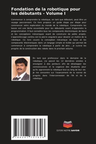 Commencer à comprendre la robotique, en tant que débutant, peut être un voyage passionnant. Ce livre propose un guide étape par étape pour commencer votre exploration du monde de la robotique. Comprendre les bases est une tâche essentielle pour les débutants avant d'apprendre la programmation. Il faut connaître tous les composants électroniques de base et les conceptions mécaniques avant de construire de petits projets. L'apprentissage continu est la pierre angulaire pour devenir un maître de la robotique. Ce livre couvre la conception mécanique de base et les composants électroniques dans un langage simple et lisible qui permet de commencer à comprendre la robotique à partir de zéro ; je suivrai les progrès de la construction des robots dans le prochain volume.