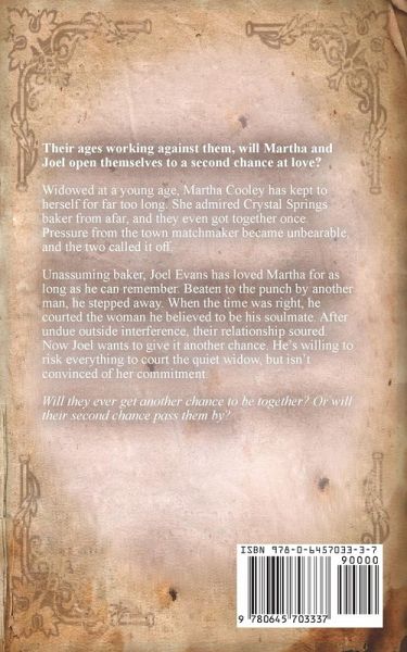 Their ages working against them, will Martha and Joel open themselves to a second chance at love? Widowed at a young age, Martha Cooley has kept to herself for far too long. She admired Crystal Springs baker from afar, and they even got together once. Pressure from the town matchmaker became unbearable, and the two called it off. Unassuming baker, Joel Evans has loved Martha for as long as he can remember. Beaten to the punch by another man, he stepped away. When the time was right, he courted the woman he believed to be his soulmate. After undue outside interference, their relationship soured. Now Joel wants to give it another chance. He's willing to risk everything to court the quiet widow, but isn't convinced of her commitment. Will they ever get another chance to be together? Or will their second chance pass them by? Author's Promise: This is a heartwarming historical novella with a happily ever after ending and no cliffhangers. It is a clean and wholesome story with nothing more than hugs, kisses, and holding hands.