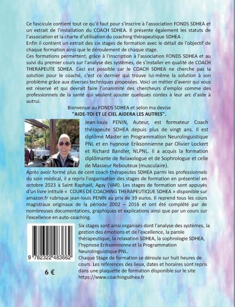 Ce fascicule contient tout ce qu'il faut pour s'inscrire à l'association FONDS SDHEA et un extrait de l'installation du COACH SDHEA. Il présente également les statuts de l'association et la charte d'utilisation du coaching thérapeutique SDHEA .Enfin il contient un extrait des six stages de formation avec le détail de l'objectif de chaque formation ainsi que le déroulement de chaque stage.