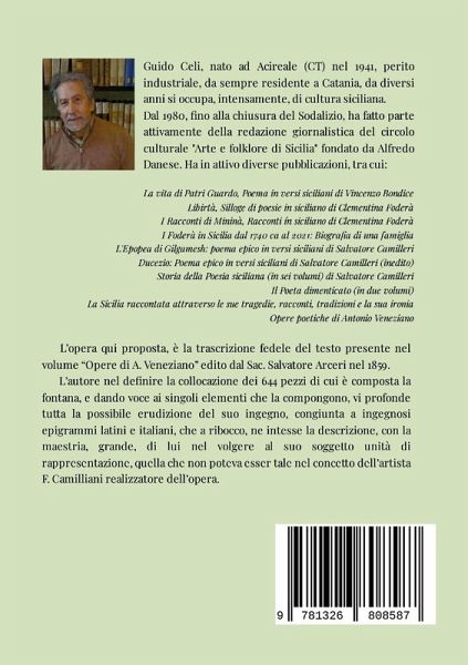 L'opera qui proposta, è la trascrizione fedele del testo presente nel volume "Opere di Antonio Veneziano" edito dal Sac. Salvatore Arceri nel 1859. L'autore nel definire la collocazione dei 644 pezzi di cui è composta la fontana Pretoria di Palermo, e dando voce ai singoli elementi che la compongono, vi profonde tutta la possibile erudizione del suo ingegno, congiunta a ingegnosi epigrammi latini e italiani, che a ribocco, ne intesse la descrizione, con la maestria, grande, di lui nel volgere al suo soggetto unità di rappresentazione, quella che non poteva esser tale nel concetto dell'artista Francesco Camilliani realizzatore dell'opera.