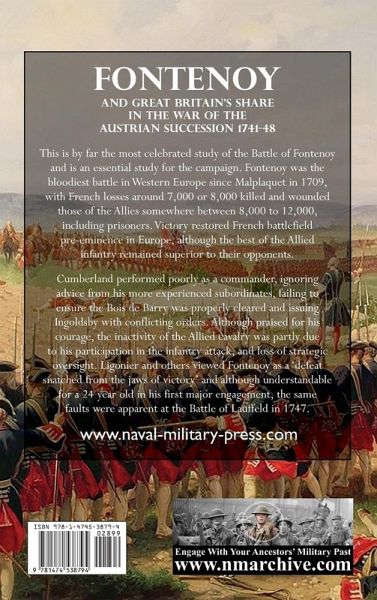 This is by far the most celebrated study of the Battle of Fontenoy and is an essential study for the campaign. Fontenoy was the bloodiest battle in Western Europe since Malplaquet in 1709, with French losses around 7,000 or 8,000 killed and wounded those of the Allies somewhere between 8,000 to 12,000, including prisoners. Victory restored French battlefield pre-eminence in Europe, although the best of the Allied infantry remained superior to their opponents. Cumberland performed poorly as a commander, ignoring advice from his more experienced subordinates, failing to ensure the Bois de Barry was properly cleared and issuing Ingoldsby with conflicting orders. Although praised for his courage, the inactivity of the Allied cavalry was partly due to his participation in the infantry attack, and loss of strategic oversight. Ligonier and others viewed Fontenoy as a 'defeat snatched from the jaws of victory' and although understandable for a 24 year old in his first major engagement, the same faults were apparent at the Battle of Lauffeld in 1747.