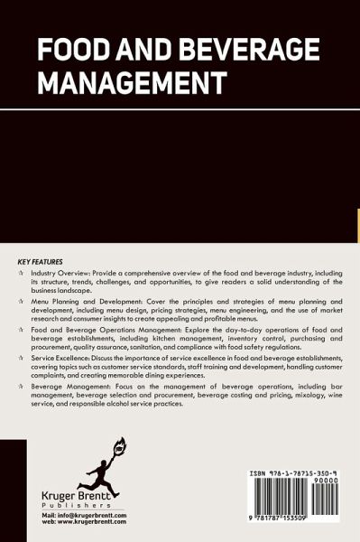 Industry Overview: Provide a comprehensive overview of the food and beverage industry, including its structure, trends, challenges, and opportunities, to give readers a solid understanding of the business landscape. Menu Planning and Development: Cover the principles and strategies of menu planning and development, including menu design, pricing strategies, menu engineering, and the use of market research and consumer insights to create appealing and profitable menus. Food and Beverage Operations Management: Explore the day-to-day operations of food and beverage establishments, including kitchen management, inventory control, purchasing and procurement, quality assurance, sanitation, and compliance with food safety regulations. Service Excellence: Discuss the importance of service excellence in food and beverage establishments, covering topics such as customer service standards, staff training and development, handling customer complaints, and creating memorable dining experiences. Beverage Management: Focus on the management of beverage operations, including bar management, beverage selection and procurement, beverage costing and pricing, mixology, wine service, and responsible alcohol service practices.