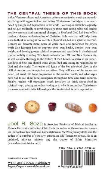 The central thesis of this book is that Western culture, and American culture in particular, needs an immediate change with regard to food and eating. Western over-indulgence is exacerbated by hunger and deprivation in the world. Learning to think theologically, and not just medically or psychologically, about one's eating habits will lead to positive personal and communal changes. In Food and God, Joel Soza offers readers a deeper understanding of Christian faith, one that will help them learn to think of eating as not merely a physical act, but as a spiritual exercise. Readers will become more aware of world need and preference for others while also learning how to improve their own health, control their own weight, and develop greater spiritual awareness and sensitivity in the daily and routine activity of eating. This book evaluates both Old and New Testaments, as well as some theology in the history of the Church, to arrive at an understanding of how one should think about food and eating in relationship to God and the world. The reader will learn of the key role food plays in the biblical creation and temptation narratives. They will learn of the enormous labor that went into food preparation in the ancient world, and what sages have had to say about food indulgence throughout time and many cultures. Finally, readers will encounter Jesus's invitation to think about food in spiritual ways, gaining an understanding as to what it means that Christianity is a movement with table fellowship at the forefront of its faith expression.