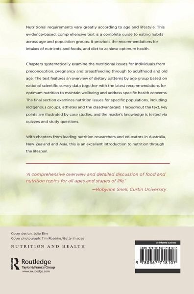 Nutritional requirements vary greatly according to age and lifestyle. This evidence-based, comprehensive text is a complete guide to eating habits across age and population groups. It provides the recommendations for intakes of nutrients and foods, and diet to achieve optimum health. Chapters systematically examine the nutritional issues for individuals from preconception, pregnancy and breastfeeding through to adulthood and old age. The text features an overview of dietary patterns by age group based on national scientific survey data together with the latest recommendations for optimum nutrition to maintain well-being and address specific health concerns. The final section examines nutrition issues for specific populations including indigenous groups, athletes and the disadvantaged. Throughout the text, key points are illustrated by case studies and the reader's knowledge is tested via quizzes and study questions. With chapters from leading nutrition researchers and educators in Australia, New Zealand and Asia, this is an excellent introduction to nutrition through the lifespan. 'A comprehensive overview and detailed discussion of food and nutrition topics for all ages and stages of life.' - Robynne Snell, Curtin University