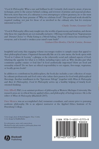 Food & Philosophy offers a collection of essays which explore a range of philosophical topics related to food; it joins Wine & Philosophy and Beer & Philosophy in in the "Epicurean Trilogy. " Essays are organized thematically and written by philosophers, food writers, and professional chefs.