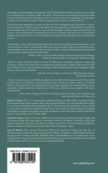 Janet M. Cramer, Ph.D., is a communication scholar specializing in media studies, sociology of media, food communication, history, gender studies, and intersectional studies. Her research publications include an examination of ideologies of womanhood in the 19th century press, the construction of race and class in various forms of media, the cultural meanings of food, and a history of media focusing on the cultural and intellectual traditions that guided mass media development in the United States, titled Media/History/Society: A Cultural History of U.S. Media (2009). Carlnita P. Greene, Ph.D., is the Dean of Behavioral, Social Sciences & Global Learning at Bunker Hill Community College. She is the author of Gourmands & Gluttons: The Rhetoric of Food Excess (2015) and editor of Foodscapes: Food, Space, and Place in a Global Society (2019). She has previously published on subjects as diverse as identity and social style and the rhetoric of popular culture. Lynn M. Walters, Ph.D., Licensed Nutritionist (NM), is the founder of Cooking with Kids, Inc., an award-winning non-profit that educates and empowers children and families to make healthy food choices through hands-on learning with fresh, affordable foods: cookingwithkids.org. Her interests focus on the behavioral effects of experiential learning with food; family, peer, and environmental influences on cooking and food choice; and the connections between gardening and health.