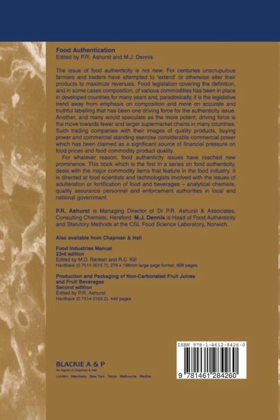 1. An introduction to food authentication.- 1.1 The issue of authenticity.- 1.2 The significance of authenticity to food processors.- 1.3 Authenticity testing.- 1.4 Compositional standards.- 1.5 Labelling and legislation.- 1.6 Databases.- 1.7 Factors affecting choice of method for authenticity determination.- 1.8 Interpreting authenticity data.- 1.9 Due diligence.- 1.10 Introduction to the series.- References.- 2 Authenticity of fruit juices, jams and preserves.- 2.1 Introduction.- 2.2 Legal investigations.- 2.3 Analytical approaches.- 2.4 Fingerprinting techniques.- 2.5 Analysis of colours.- 2.6 Other methods.- 2.7 Jams and preserves.- 2.8 Conclusions.- Recent developments.- References.- 3 Wine authenticity.- 3.1 Introduction.- 3.2 Multidimensional analysis applied to wine.- 3.3 Distinction according to geography.- 3.4 Varieties.- 3.5 Age.- 3.6 Special examples.- 3.7 Conclusion.- References.- Further reading.- 4 Authenticity of meat and meat products.- 4.1 Introduction.- 4.2 Components of meat products.- 4.3 Examination procedures.- 4.4 Detection and determination of non-meat proteins.- 4.5 Mechanically recovered meat (MRM).- 4.6 Summary.- References.- 5 Authenticity of fish.- 5.1 Introduction.- 5.2 Objective methods of fish species identification.- 5.3 Principles of electrophoresis and isoelectric focusing.- 5.4 Separation systems.- 5.5 Nature of fish-flesh proteins.- 5.6 Experimental procedures for electrophoretic methods.- 5.7 Alternative protein-based methods of fish-species identification.- 5.8 DNA techniques of fish species identification.- 5.9 Fish eggs.- 5.10 General conclusions.- References.- 6 Authenticity of cereals.- 6.1 Introduction.- 6.2 Overview of techniques.- 6.3 Wheat and barley variety identification.- 6.4 Common wheat in durum pasta.- 6.5 Basmati rice.- 6.6 Conclusion.- References.- 7 Authenticity of vegetable oils.- 7.1 Introduction.- 7.2 Specific tests for identity and estimation of impurities.- 7.3 Fatty acid composition by GLC.- 7.4 Sterols and other minor components.- 7.5 Triglycerides.- 7.6 Data analysis techniques.- 7.7 Stable carbon isotope ratio analysis (SCIRA).- 7.8 Olive oil.- 7.9 Other vegetable oils.- 7.10 Castor oil in other oils.- 7.11 Mineral oil contamination.- 7.12 Animal fat in vegetable fat.- 7.13 Toxic oil syndrome.- 7.14 Conclusions.- References.- 8 Authenticity of honey.- 8.1 Introduction.- 8.2 Authenticity of honey.- 8.3 Methods for determining authenticity.- 8.4 Uncertainty resulting from variability in the natural product.- References.- 9 Authenticity of coffee.- 9.1 Introduction.- 9.2 Authenticity of green coffee.- 9.3 Authenticity of roasted coffee.- 9.4 Adulteration in roasted and ground coffee.- 9.5 Adulteration of soluble (instant) coffee.- 9.6 Adulteration in coffee/coffee-substitute blends.- 9.7 Authenticity of decaffeinated products.- 9.8 Conclusions.- References.- 10 Authentication of egg and egg products.- 10.1 Egg production.- 10.2 Grading.- 10.3 Methods for assessing egg classification.- 10.4 Incubated clears.- 10.5 Liquid eggs.- 10.6 Conclusions.- References.- 11 Other commodities.- 11.1 Introduction.- 11.2 Tea.- 11.3 Spices, herbs and condiments.- 11.4 Flavours and essences.- 11.5 Organic production of agricultural products.- 11.6 Natural mineral water.- 11.7 Genetically engineered organisms.- 11.8 Irradiated products.- References.- 12 Milk and milk products.- 12.1 Authenticity issues.- 12.2 Analytical methods for milk and milk product authenticity.- 12.3 Effects of adulteration on the market for milk products.- References.