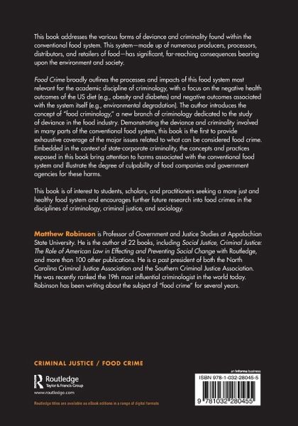 This book is of interest to students, scholars, and practitioners seeking a more just and healthy food system and encourages further future research into food crimes in the disciplines of criminology, criminal justice, and sociology.