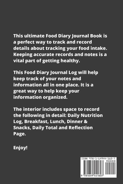 This Food Diary notebook tracker is a great way to focus on your health and keeping you aware of what's going into your body. Whether your goal is for losing weight, fitness, or just get healthy, this planner is perfect for tracking your meals and nutrition. The interior pages of this notebook includes space to record the following: Daily Nutrition Log - Record & Write Fat, Calories, Sugar, Carbs, Protein, Fiber & Sodium for Meals and Snacks. Breakfast, Lunch, Dinner & Snacks - Log your Food Intake for each meal you eat and snack for the day. Daily Total - Keep track of your Daily Totals. Reflection Page - For writing how your day went, did you exercise, water intake you consumed, activity, any symptoms you experiences, stool, weight loss amount & results, etc. or any other important information you want. Will also make a perfect gift for that special person in your life who wants to track their food and nutrition. Journals can help you keep all of your important information all in one place. Simple and easy to use. Size is 6x9 inches, 114 pages, soft matte finish cover, white paper, black ink, paperback.