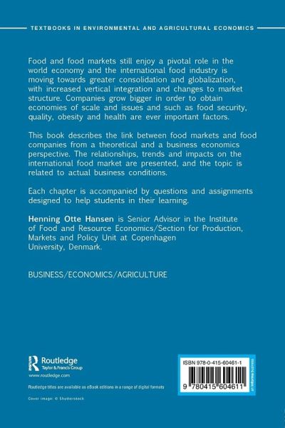 Food and food markets still enjoy a pivotal role in the world economy and the international food industry is moving towards greater consolidation and globalization, with increased vertical integration and changes to market structure. Companies grow bigger in order to obtain economies of scale and issues and such as food security, quality, obesity and health are ever important factors. This book describes the link between food markets and food companies from a theoretical and a business economics perspective. The relationships, trends and impacts on the international food market are presented, and the topic is related to actual business conditions. Each chapter is accompanied by questions and assignments designed to help students in their learning. .
