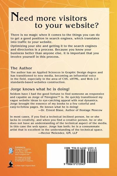 There is no magic when it comes to the things you can do to get a good position in search engines. This is a simple book with many resources to build traffic to your website, written in easy-to-understand language. -How to choose the right keywords and key phrases. -How to feed the robots and prepare your content. -Search Engines friendly links and content. -How to setup a Blog to get traffic. -Tools to use to track your progress. -RSS feeds to get traffic. -What Google sees in your site. -How to make Search Engine Submissions work. -How to use social networks. -Using local directories. -Using free services to create mirror pages. -See what your competition is doing. -How convert visitors into clients. -Free resources, Lists of Search Engines, Directories and Networks Submission Pages. -Free lists of tools to grow your web presence. -A Glossary section to understand common used web terms. More about Nuregime Web Design at: www.nuregime.com