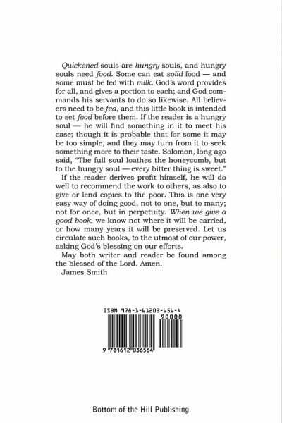 Quickened souls are hungry souls, and hungry souls need food. Some can eat solid food - and some must be fed with milk. God's word provides for all, and gives a portion to each; and God commands his servants to do so likewise. All believers need to be fed, and this little book is intended to set food before them. If the reader is a hungry soul - he will find something in it to meet his case; though it is probable that for some it may be too simple, and they may turn from it to seek something more to their taste. Solomon, long ago said, "The full soul loathes the honeycomb, but to the hungry soul - every bitter thing is sweet." If the reader derives profit himself, he will do well to recommend the work to others, as also to give or lend copies to the poor. This is one very easy way of doing good, not to one, but to many; not for once, but in perpetuity. When we give a good book, we know not where it will be carried, or how many years it will be preserved. Let us circulate such books, to the utmost of our power, asking God's blessing on our efforts. May both writer and reader be found among the blessed of the Lord. Amen. James Smith