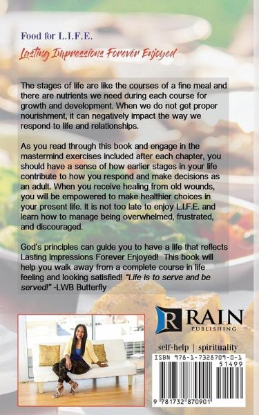 The stages of life are like the courses of a fine meal and there are nutrients people need during each course for growth and development. When someone doesn’t get the proper nourishment, it can negatively impact the way they respond to life and relationships. As you read through this book and engage in the exercises included after each chapter, you should have a sense of how earlier stages of your life contribute to how you respond and make decisions as an adult. When you receive healing for old wounds, you will be empowered to make healthier choices in your present. It is not too late to enjoy life and learn how to manage being overwhelmed, frustrated, and discouraged. God’s principles can guide you to have a life that reflects Lasting Impressions Forever Enjoyed! This book will help you walk away from a complete course of life feeling and looking satisfied! "Life is to serve and be served!" -LWB Butterfly