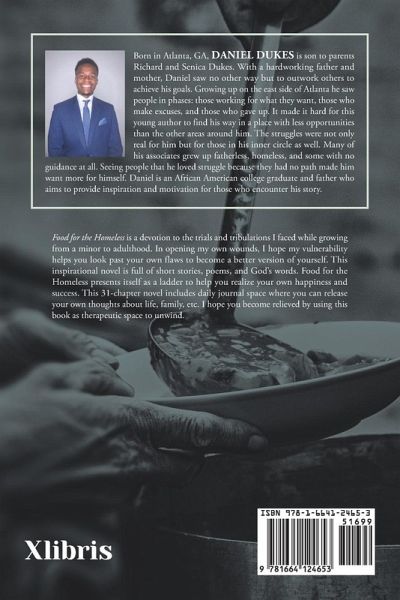 Food for the Homeless is a devotion to the trials and tribulations I faced while growing from a minor to adulthood. In opening my own wounds, I hope my vulnerability helps you look past your own flaws to become a better version of yourself. This inspirational novel is full of short stories, poems, and God's words. Food for the Homeless presents itself as a ladder to help you realize your own happiness and success. This 31-chapter novel includes daily journal space where you can release your own thoughts about life, family, etc. I hope you become relieved by using this book as therapeutic space to unwind.
