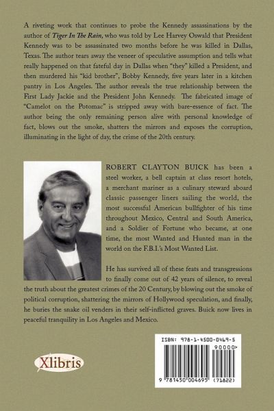 A riveting work that continues to probe the Kennedy assassinations by the author of Tiger In The Rain, who was told by Lee Harvey Oswald that president Kennedy was to be assassinated two months before he was killed in Dallas, Texas. The author tears away the veneer of speculative assumption and tells what really happened on that fateful day in Dallas when "they" killed a President, and then murdered his "kid brother," Bobby Kennedy, five years later in a kitchen pantry in Los Angeles. The author reveals the true relationship between the First Lady Jackie and the President John Kennedy. The fabricated image of "Camelot on the Potomac" is stripped aware with bare-essence of fact. The author being the only remaining person alive with personal knowledge of fact, blows out the smoke, shatters the mirrors and exposes the corruption, illuminating in the light of day, the crime of the 20th century. For a more detailed and indepth insight about the author and his works go to website www.RobertClaytonBuick.com.