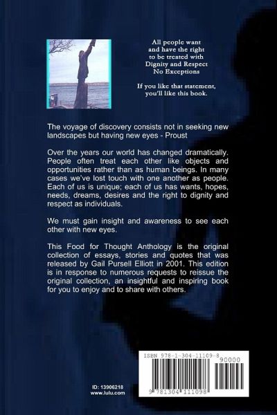 Over the years our world has changed dramatically. People often treat each other like objects and opportunities rather than as human beings. In many cases we've lost touch with one another as people. Each of us is unique; each of us has wants, hopes, needs, dreams, desires and the right to dignity and respect as individuals. We must gain insight and awareness to see each other with new eyes. This Food for Thought Anthology is the original collection of essays, stories and quotes that was released by Gail Pursell Elliott in 2001. This edition is in response to numerous requests to reissue the original collection, an insightful and inspiring book for you to enjoy and to share with others.