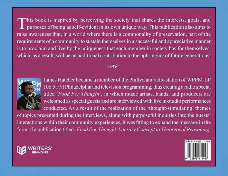 Synopsis: This book is inspired by perceiving the society that shares the interests, goals, and purposes of being as self-evident in its own unique way. This publication also aims to raise awareness that, in a world where there is a commonality of preservation, part of the requirements of a community to sustain themselves in a successful and appreciative manner is to proclaim and live by the uniqueness that each member in society has for themselves, which, as a result, will be an additional contribution to the upbringing of future generations.Autobiography: James Hatcher became a member of the PhillyCam radio station of WPPM-LP 106.5 FM Philadelphia and television programming, thus creating a radio special titled 'Food For Thought, ' in which music artists, bands, and producers are welcomed as special guests and are interviewed with live in-studio performances conducted. As a result of the realization of the 'thought-stimulating' themes of topics presented during the interviews, along with purposeful inquiries into the guests' interactions within their community experiences, it was fitting to expand the message in the form of a publication titled 'Food For Thought' Literary Concept to Theoretical Reasoning.
